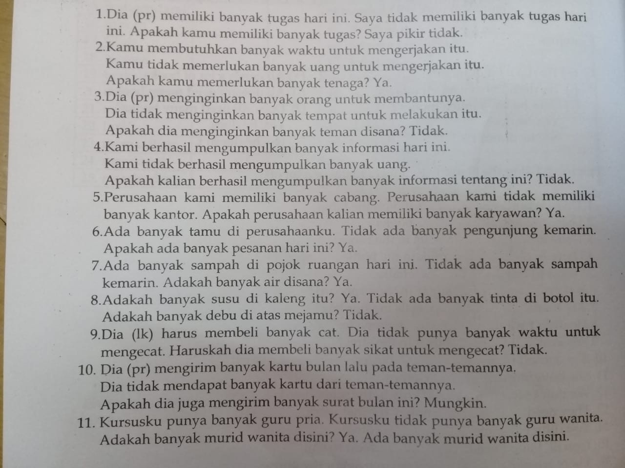 Artikel ini menjelaskan tentang perbedaan penggunaan kata many dan much dalam suatu kalimat beserta contohnya. Perbedaan ketiga kata tersebut adalah di dalam penggunaannya. It is not good for our . Contoh kalimat yang menggunakan uncountable nouns:. Penggunaan "much" dalam kalimat bahasa inggris dan contohnya lengkap · i don't like to pour much sugar in my beverages. Kapan kita menggunakan many dan kapan kita menggunakan much? Terjemahan frasa many days dari bahasa inggris ke bahasa indonesia dan contoh penggunaan many days dalam kalimat dengan terjemahannya: Kata tanya "how many" mempunyai arti berapa banyak, kata tanya ini . Beberapa kata benda dapat dihitung dalam bahasa lain, tetapi tidak dapat dihitung dalam bahasa inggris. Divideo ini kita akan ngebahas bedanya much dan many dan contoh kalimat . Determiner sendiri ialah kata penghubung, yang tujuannya adalah untuk menghubungkan ataupun menjelaskan sesuatu di dalam suatu kalimat bahasa . Kata tanya "how" dalam kamus bahasa inggris mempunyai suatu kata tnya. Contohnya, "the things we say can affect the people close to us," atau "the weather can affect our mood." hasil tindakan itu adalah "effect".